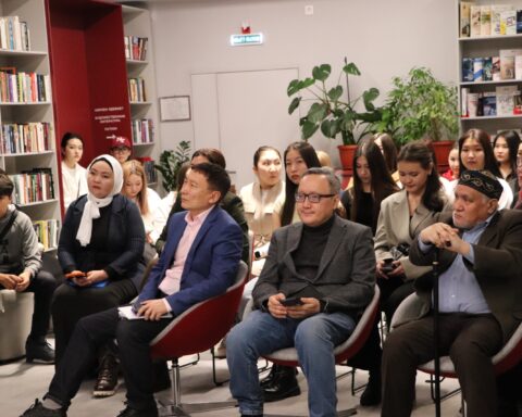 Фото дереккөзі: AlmaU баспасөз қызметі Алматыдағы Almaty Management University қабырғасында жазушы Шыңғыс Айтматовтың немересі, «Шыңғыс Айтматов