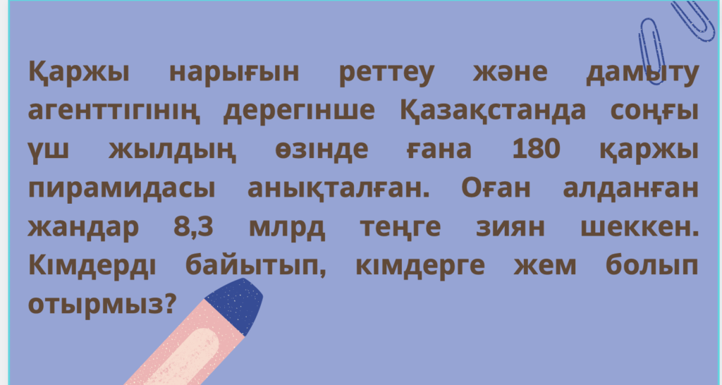 Қаржы нарығын реттеу және дамыту агенттігінің дерегінше Қазақстанда соңғы үш жылдың өзінде ғана 180 қаржы пирамидасы анықталған. Оған алданған жандар 8,3 млрд теңге зиян шеккен. Кімдерді байытып, кімдерге жем болып отырмыз? Бұл жағдайда «ақшаны еңбекпен емес, айламен табатын жандар» Вавилондағы ең бай адамның «теориясын» сатып, өздері сол «ең бай адамға» айналудың жолын тапқандай.