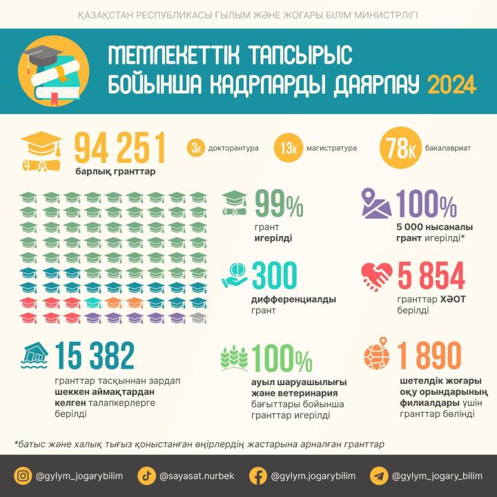 2024-2025 жылғы оқу жылына арналған білім гранты иегерлерінің тізімі жарияланды. Жалпы грант саны 94 мыңнан астам, оның ішінде 78 мың грант – бакалавриат студенттеріне, 13 мың грант магистратураға берілсе, 3 мың грант болашақ докторанттарға қарастырылған.