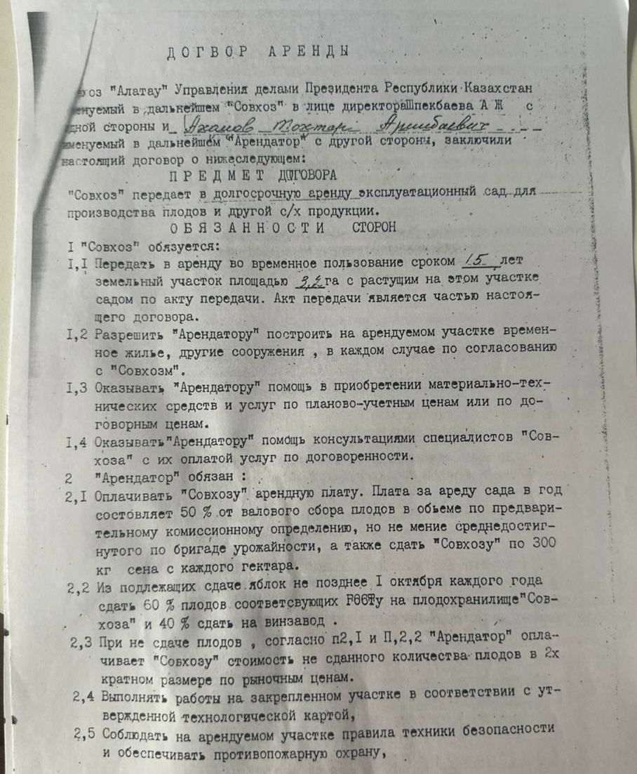 Тохтар ата бұл жерде 15 жыл бойы апорт алмасын өсіріп, өнім жинап, «Алатау» шаруашылығынан алма тасып келді. 2011 жылы жалға алу мерзімін ұзартуға барса, жердің 9 жыл бұрын заңсыз сатылып кеткенін анықтайды.
