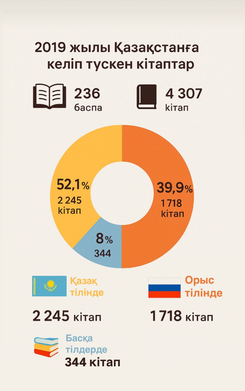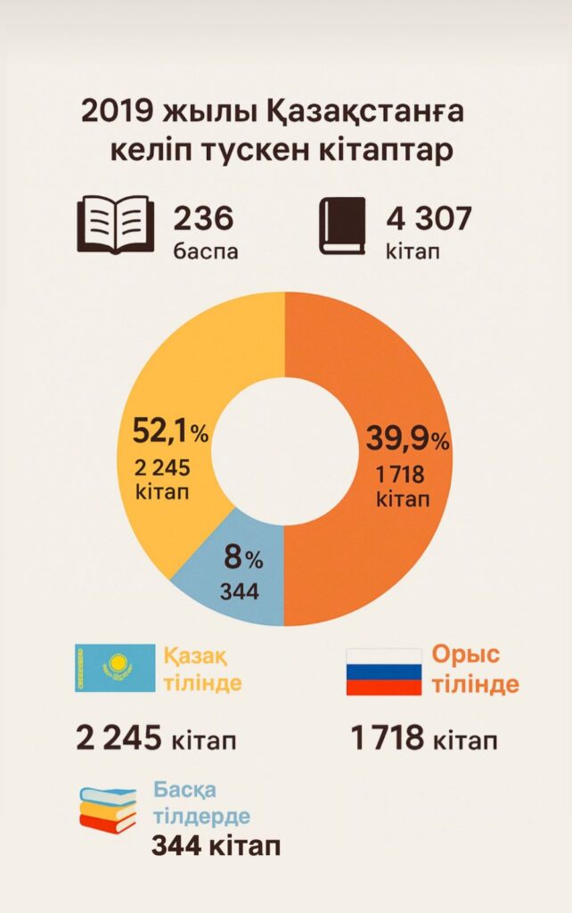 ҚР Ұлттық мемлекеттік Кітап палатасының «Статистика және кітап нарығына мониторинг жасау» бөлімінің басшысы Алтын Абдрахманованың айтуы бойынша кітап палатасы жыл сайын таралымы бойынша, атау саны бойынша ең көп кітап шығарған алдыңғы қатарлы он баспаны анықтап отырады. 2018 жылы осы қатарда «Атамұра», «Фолиант», «Алматыкітап» , «Мектеп» т.б. баспалар енген. 2019 жылы бізге 236 баспадан 4 307 кітап келіп түскен. Оның 52,1 пайызы – қазақ тілінде, 39,9 пайызы – орыс тілінде, қалғаны – әртүрлі тілдердің еншісінде. Негізі өзін-өзі жетілдіру, тұлғалық даму бағытындағы кітаптар сұранысқа ие, – дейді «Статистика және кітап нарығына мониторинг жасау» бөлімінің басшысы Алтын Абдрахманова.