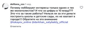 “Неге тек сол бір монополистердің мүддесін қолдай береді? Және 10 млрд деген қайдан шыққан??? Бұл өзі қандай жұмыстар? Бұл ақшаға мектептер мен балабақшалар салуға болмай ма, олар қалада жетіспейді ғой!!! Бұған назар аударыңыз”