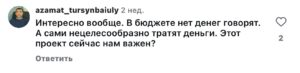 “Қызық екен. Бюджетте ақша жоқ дейді. Ал өздері ақшаны дұрыс емес жаратады. Бұл жоба біз үшін қазір маңызды ма?”