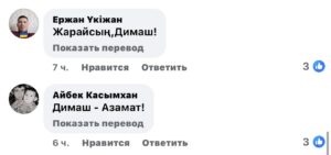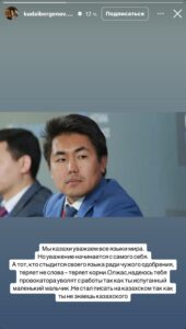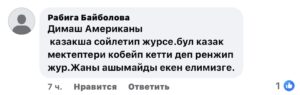 “Біз, қазақтар, әлемнің барлық тілін құрметтейміз. Бірақ, құрмет өзіңнен басталады. Өз тіліңен ұялып,өзгенін мақұлдауына ұмтылған адам сөзін емес, тамырын жоғалтады. Олжас,сен провокаторды жұмыстан шығарады деп үміттенемін, өйткені сен қорқақ, кішкентай бала сияқтысың. Сен қазақша білмегендіктен қазақ тілінде жазбадым”.