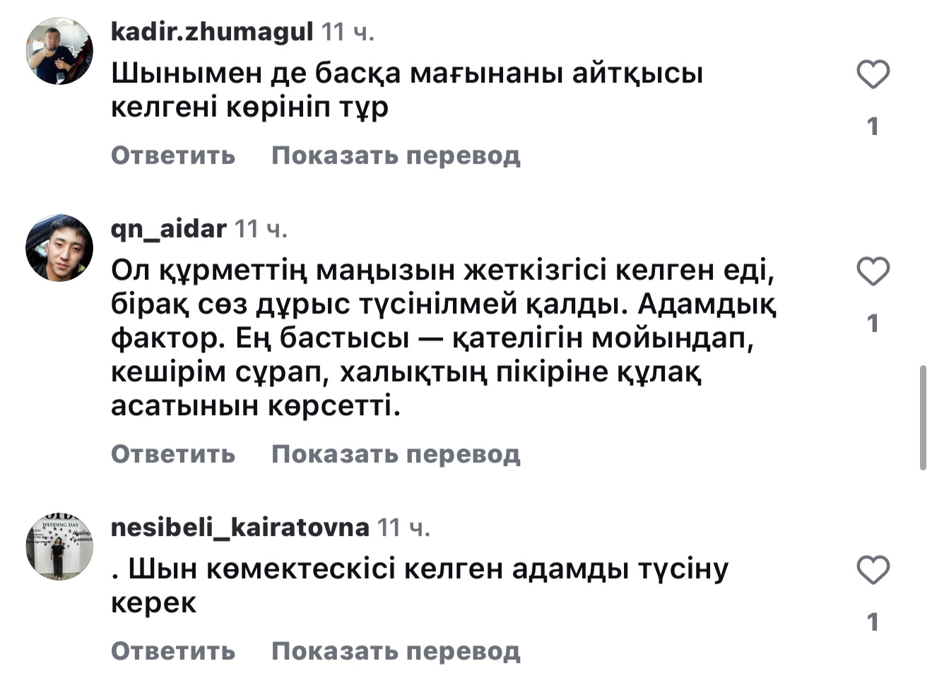 Кезегі жеткенде залдағы бірнеше адам сөзін бөліп, оған кедергі жасай бастады. Регламентті сактауға шақырдым. Алайда орыс тілінде айтқан сөзімде қателік бар. Ойымды дұрыс жеткізбеппін. «Құдай үлкен сынақ берген» деп айтпақ, болғанмын. Айтқан сөзім көпшіліктің көңіліне, тіпті намысына тигенін де түсіндім. Осы үшін шын ниетіммен кешірім сұраймын», – делінген жазбада.