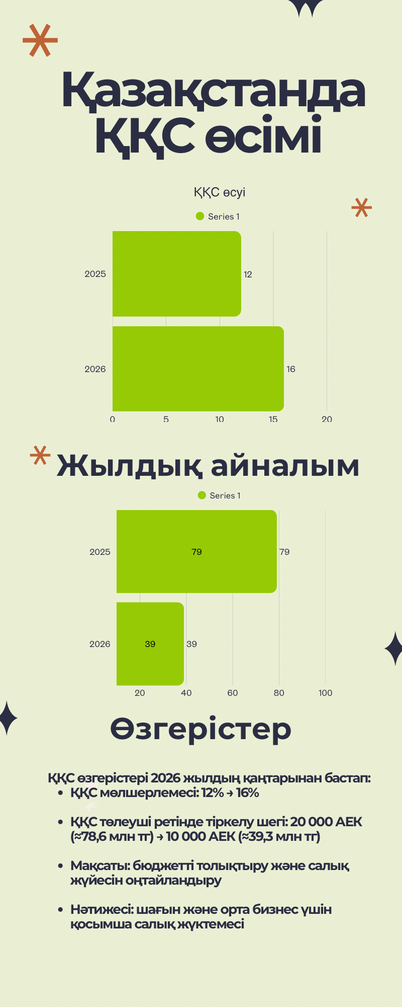 2026 жылдың қаңтарынан бастап Қазақстанда қосылған құн салығы (ҚҚС) 12%-дан 16%-ға дейін көтеріледі. Үкімет бұл өзгерісті бюджет кірісін ұлғайту және салық жүйесін жаңғырту мақсатында енгізіп отыр. Қазір ҚҚС төлеуші ретінде тіркелу үшін кәсіпкердің жылдық айналымы 20 000 АЕК(АЕК – айлық есептік көрсеткіш), яғни шамамен 78,6 миллион теңгеден асуы қажет. Алайда 2026 жылы күшіне енетін жаңа Салық кодексі бойынша бұл шек екі есеге төмендеп, 10 000 АЕК немесе 39,3 миллион теңге болады. Мұндай өзгерістер салық жүйесін оңтайландыруды көздегенімен, оның нақты әсері туралы экономистер мен кәсіпкерлер арасында түрлі пікірлер бар.