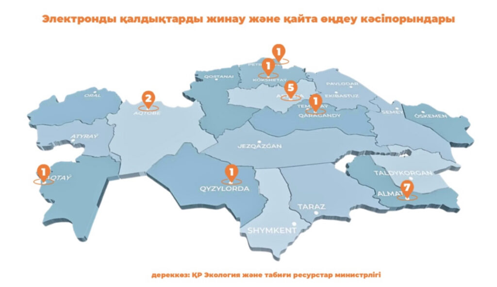 Қазақстанда электронды қалдықтарды қабылдап, өңдеумен арнайы лицензиясы бар кәсіпорындар айналысады. Экология және табиғи ресурстар министрлігінің дерегінше, бүгінде 19 мамандандырылған ұйым тіркелген. Бұл кәсіпорындардың басым бөлігі ірі қалаларда. Мәселен, Алматы қаласында электронды қалдықтарды қабылдайтын және өңдейтін 7 пункт, Астанада 5 пункт бар. Қалған 7 кәсіпорын басқа 6 қалада орналасқан. Мегаполистің өзінде қабылдау пунктерінің саны халық санына шаққанда жеткіліксіз. Ал кейбір аймақта мұндай инфрақұрылым мүлде жоқ. Алматы қаласындағы экология шараларын ұйымдастырушы, экоинфлюенсер Камила Акимбекованың сөзінше, қоқысты сұрыптауға өткізетін жер көп әрі жалпыға бірдей қолжетімді болуы қажет.