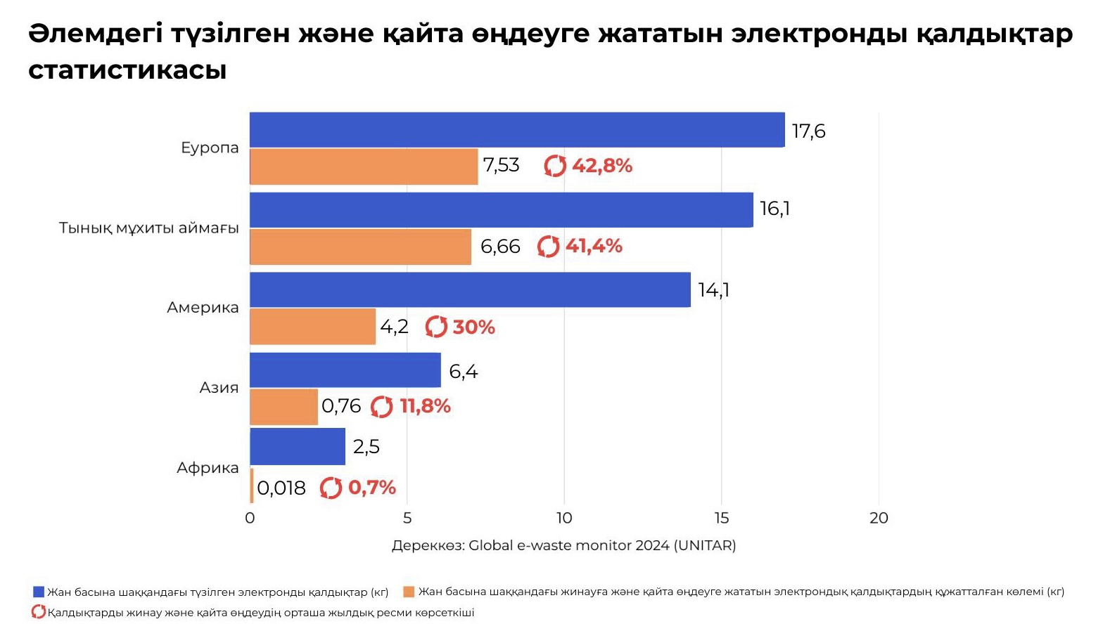 Global E-waste Monitor (GEM) дерегінше, жыл сайын әлемде электронды қалдық саны 2,6 млн тоннаға өсіп жатыр. Ал UNITAR болжамы бойынша, 2050 жылы Қазақстандағы электронды қалдық көлемі 432 млн тоннаға жетуі мүмкін.