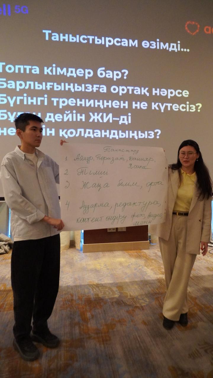 Сондай-ақ тренер Баубектің дәрісінде қатысушылар жасанды интеллект көмегімен әлеуметтік желіге арналған рилс жасап көріп, тәжірибе алмасты. Тренингтің соңында жасаған жұмыстарының нәтижесі бойынша марапатталып, демеушілерден сыйлық тарту етілді.