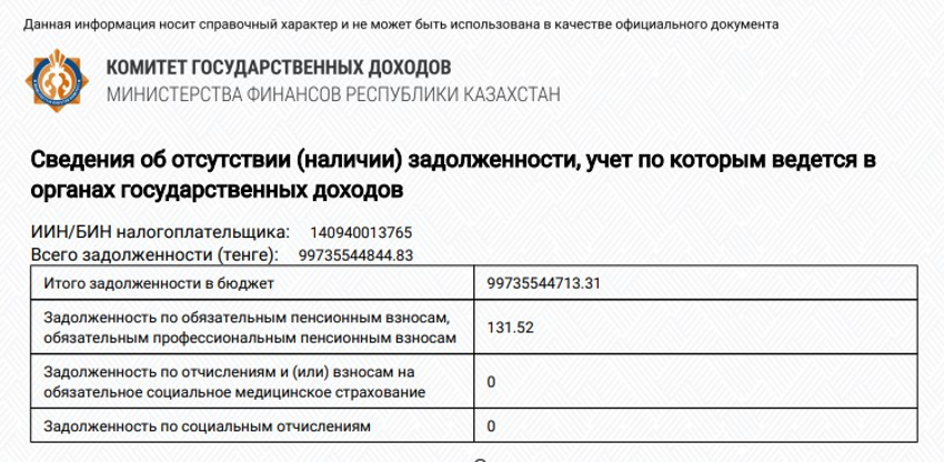 Сурет: Мемлекеттік кірістер комитетінің ресми веб-порталынан алынған салық қарызы туралы ақпарат