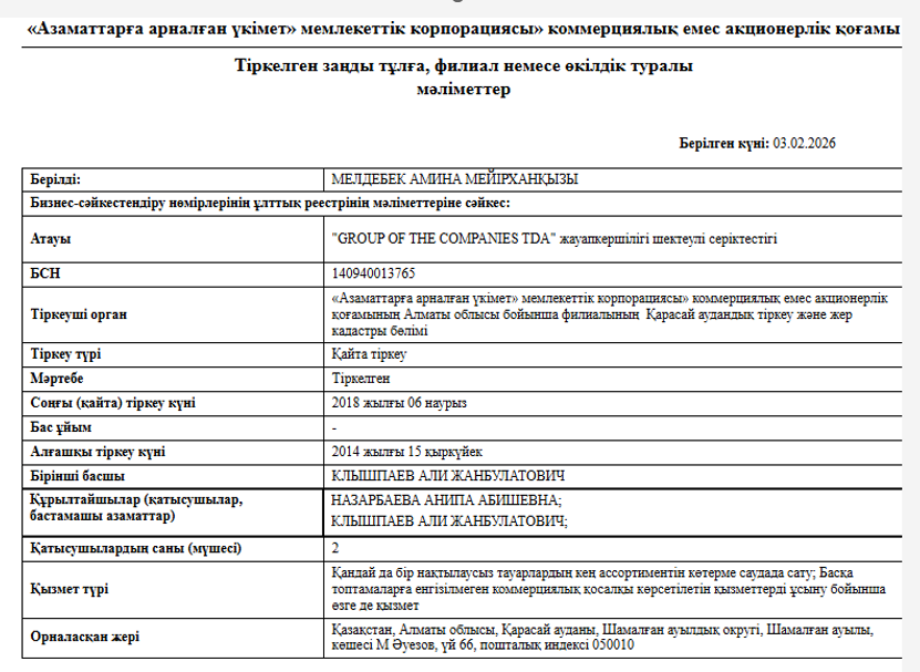 «GROUP OF THE COMPANIES TDA» ЖШС 2014 жылы тіркелген.