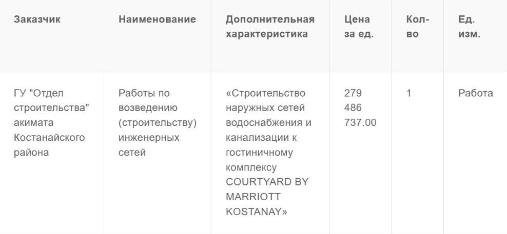 Тапсырыс беруші – Қостанай ауданы әкімдігінің құрылыс бөлімі. Жобаның бастапқы құны 279,4 млн теңге болса, нәтижесінде келісімшарт шамамен 273,9 млн теңгеге жасалған. Бұл қаражат толықтай бюджет есебінен бөлінеді. Тендер 1 сәуір күні аяқталған. Жеңімпаз «Изомир» ЖШС. 273,9 млн теңгеге жобаны аяқтауға келіскен. Жоба аясында су жүйесі қалалық желілерге қосуды, кәріз жүйесі қолданыстағы инфрақұрылымға бағыттауды және Тобыл өзені арқылы су асты құбырын жүргізуді жоспарлап отыр. Алайда, конкурстың өтуін қарастырып көрсек, біраз күмән тудырады. Тендерге 12 компания қатысып, барлығы бірдей баға ұсынған.  Оның үстіне жеңімпаз компания өтінімді ең соңында, 31 наурыз күні сағат 19:21-де, ұсыныстар қабылдау аяқталуына бірнеше сағат қалғанда берген.