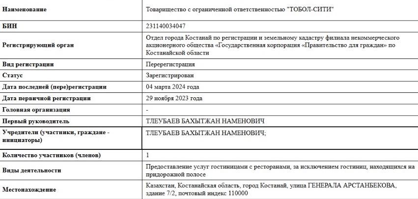 Қонақүй құрылысын Тобол-Сити ЖШС жүргізіп жатыр. Компания 2023 жылғы 29 қарашада Қостанайда тіркелген. Компанияның негізгі қызметі – мейрамханасы бар қонақүй қызметтерін көрсету. Компанияның құрылтайшысы әрі басшысы – Бахытжан Тлеубаев. Ол Қостанай облыстық мәслихатының VII шақырылымының бұрынғы депутаты.