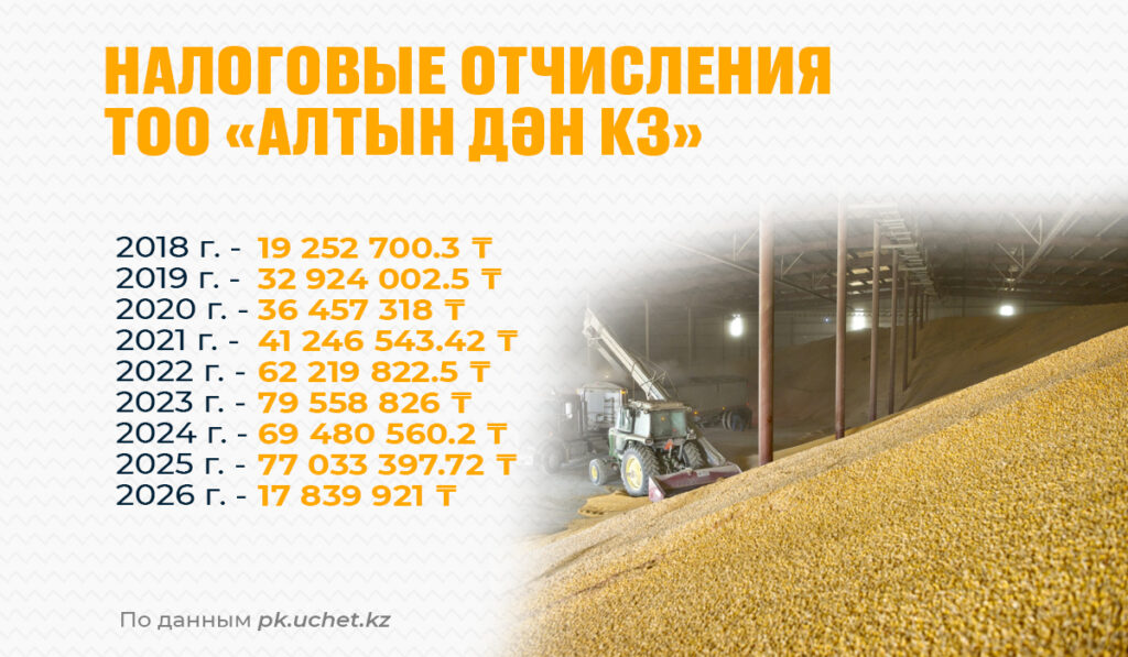 Кәсіпкердің тағы бір активі – 2015 жылы Ақмола облысында тіркелген «Алтын Дән КЗ» ЖШС. Компания астық сақтаумен айналысады. Мұнда да қаржылық көрсеткіштер айтарлықтай жоғары: әр жылдары кәсіпорынның салық төлемдері 70–80 млн теңгеге дейін жеткен. Сонымен қатар кәсіпкерге «Намен» шаруа қожалығы да тиесілі.
