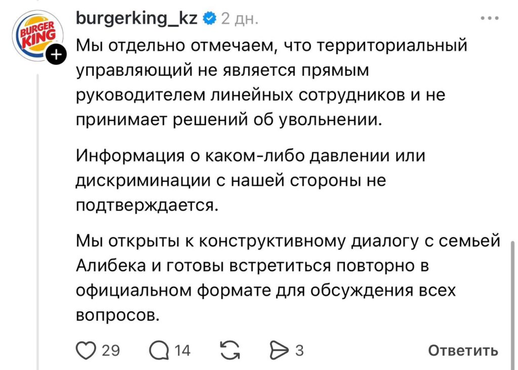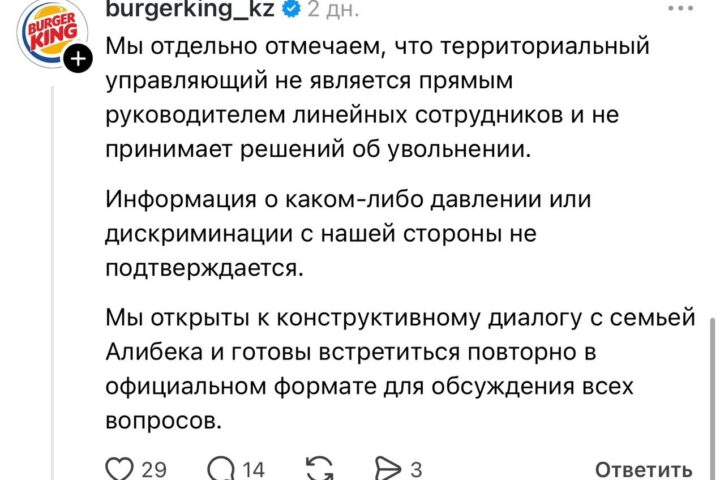 Қазақстанда жылдам тамақтану желісі Burger King Kazakhstan төңірегінде қоғамдық резонанс тудырған жағдай туындады. Әлеуметтік желілерде аутизм спектріндегі бұзылысы бар қызметкерге қатысты жазба кең таралып, мәселе тек еңбек қатынастары емес, инклюзивті орта мен